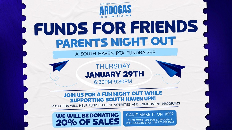 Join us Thursday, January 29th, for a Parents Night Out benefiting the South Haven PTA. We’ll donate 20% of all sales — helping fund activities and enrichment programs for the kids! Can't come the 29th? Stop by on the 30th!